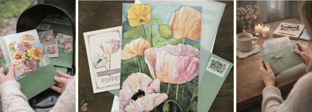 - A piece of real mail designed to bring a small pause and a bit of beauty into your day