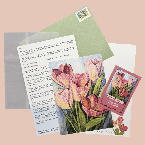 Each delivery includes a 5×7 art print reproduction of my original watercolor, printed on textured watercolor paper, a letter from the studio, and a flower information card—all mailed in a green stamped envelope.